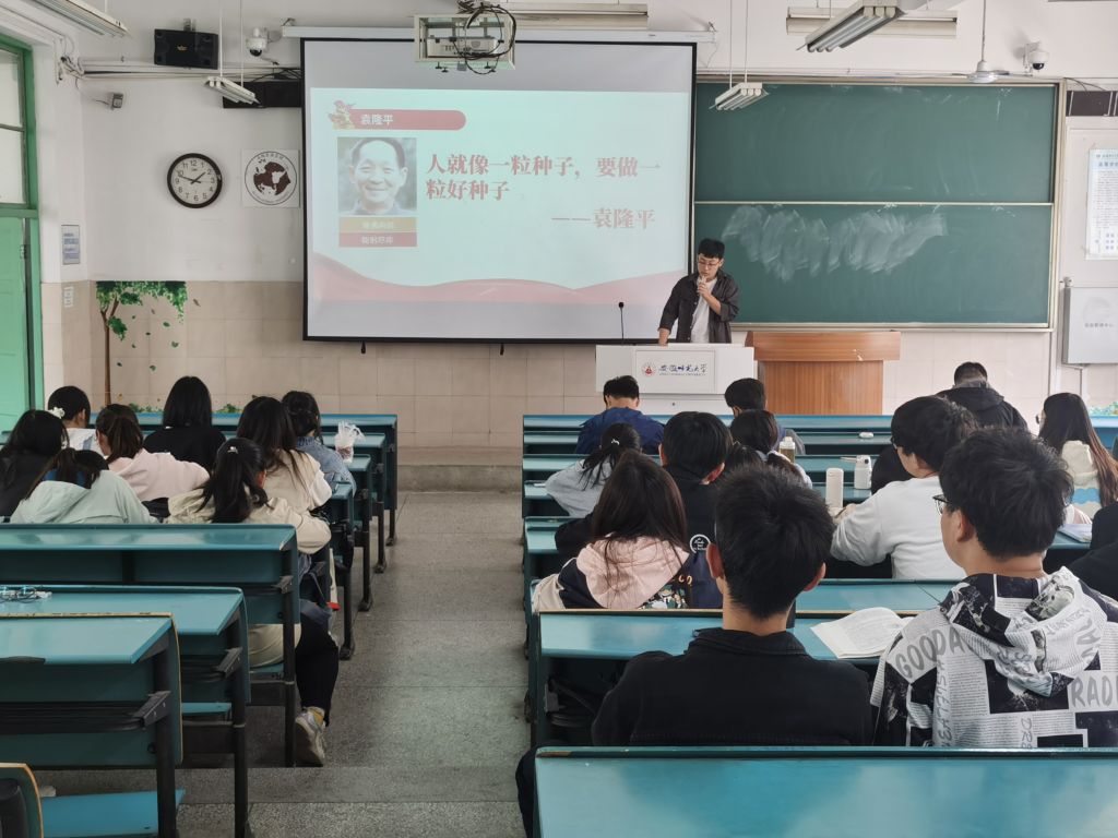 李润同学主要介绍了我国研究与发展杂交水稻的开创者,被誉为“杂交水稻之父”的袁隆平院士。袁老曾立誓要解决粮食增产问题,不让人民挨饿,他勇于同传统观点说不,成功育出高产杂交水稻。“人就像一粒种子,要做粒好种子”,这是袁隆平生前常说的话,他用一生,为这句话写下了注脚。“我们何其有幸,见证科学群星闪耀;又何其无奈,目送他们渐渐离去。春回大地,我们不忘初心,牢记使命,迎候生机与可能,迎接机遇与挑战。”李润的发言激发了青年团员们的使命感与责任感,吾辈当自强!