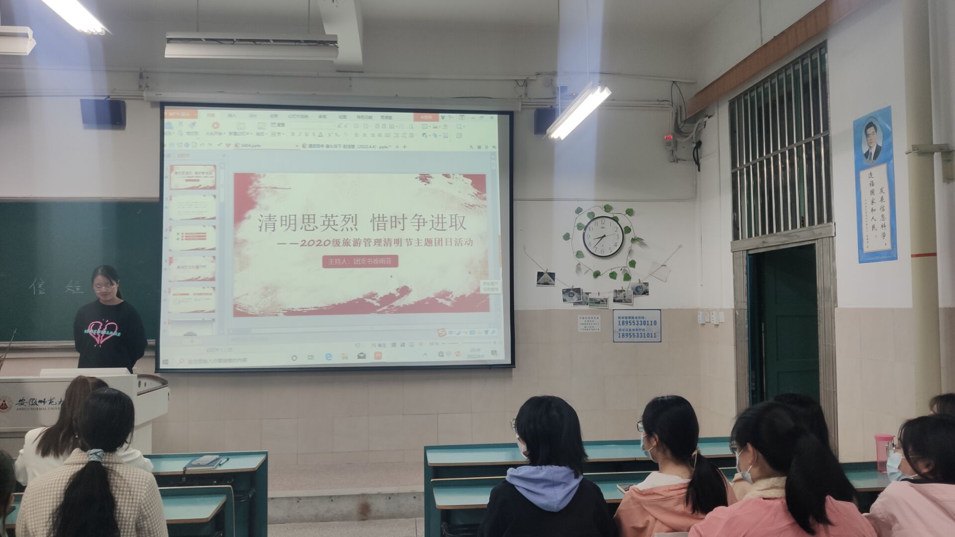 赵佳慧 舒玉茹)为切实发挥中华民族传统节日的涵育功能,进一步引导青年团员传承民族精神,坚定理想信念,牢记英烈的丰功伟绩、传承英烈的伟大精神,用实际行动庆祝建团100周年。2020级旅游管理于4月4日晚开展“清明祭英烈 惜时争进取”主题团日活动。本次活动由团支书徐雨菲主持,校团委朱蕾老师、辅导员赵佳慧老师出席活动,2020级旅游管理全体本科生参加。