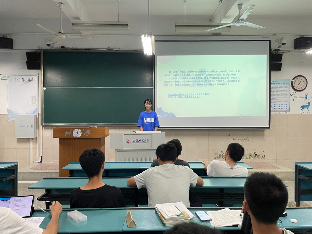 会上,何伊婷分别从“把握第一课堂、制定学习计划、严肃考风考纪、加强师生交流”四个方面强调班级学风建设,严格落实考勤制度,遵守课堂纪律,提高课堂效率,提醒同学们合理制定期中复习计划,落实学习目标,积极备考,遇到学习困难及时与老师进行沟通交流,同时强调诚信应考,遵守考纪。