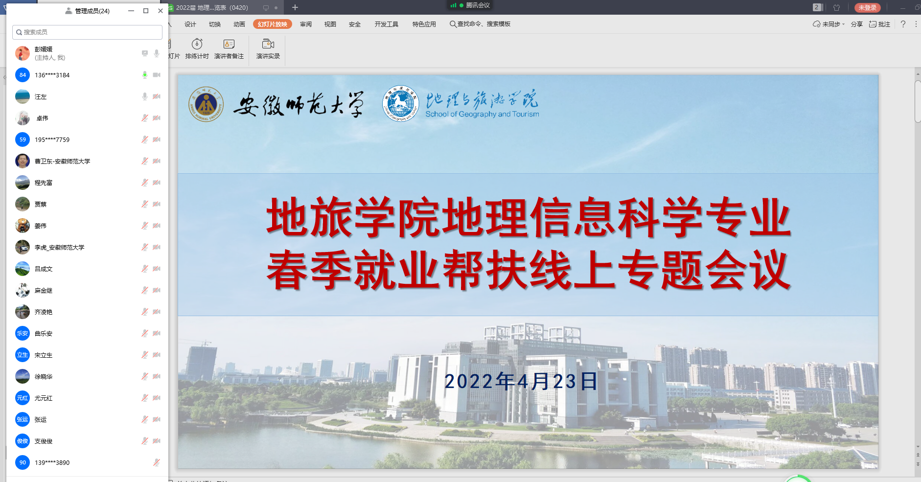 地理信息科学专业召开春季就业帮扶线上专题会议,学院党委书记贾冠忠、党委副书记乔静、副院长曹卫东、地理信息科学专业全体教师及辅导员彭媛媛参加了此次会议。会议由地理信息科学专业负责人汪左主持。