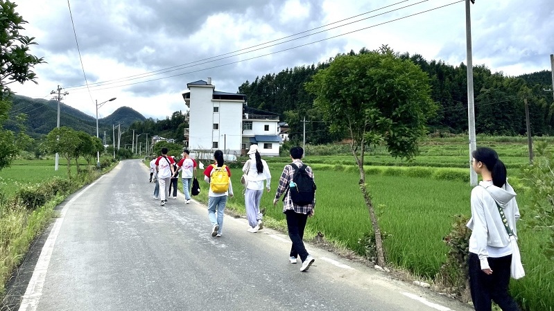 沿着田间小道,队员们兵分两路,一部分前往村民住处实地调研,另一部分前往村委会采访村干部当地乡村振兴战略的具体实施。前者来到村民家中,经过一番采访询问,村民表示这里的生活发生了翻天覆地的变化;后者在与村干部及相关专业人员交谈中也得知,桂花村经济来源主要来自农产品的种植,尤其是当地特色的紫红米,政府有出资帮助打造销售特色农产品的电商平台,面向全国,拉动当地产业发展,扩展产业链;在红色文化传承,文娱设施打造方面也取得了一定的成就。