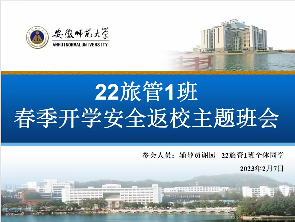 为增强学生安全意识,切实做好春季学生返校的各项工作,帮助学生平安顺利返校,2022级旅游管理1班和2班分别于2月7日下午三点、四点召开春季开学安全返校提醒线上主题班会。本次班会由各班班长卢江珊、申楷辰主持,辅导员谢园老师和22级旅游管理专业全体同学参加。