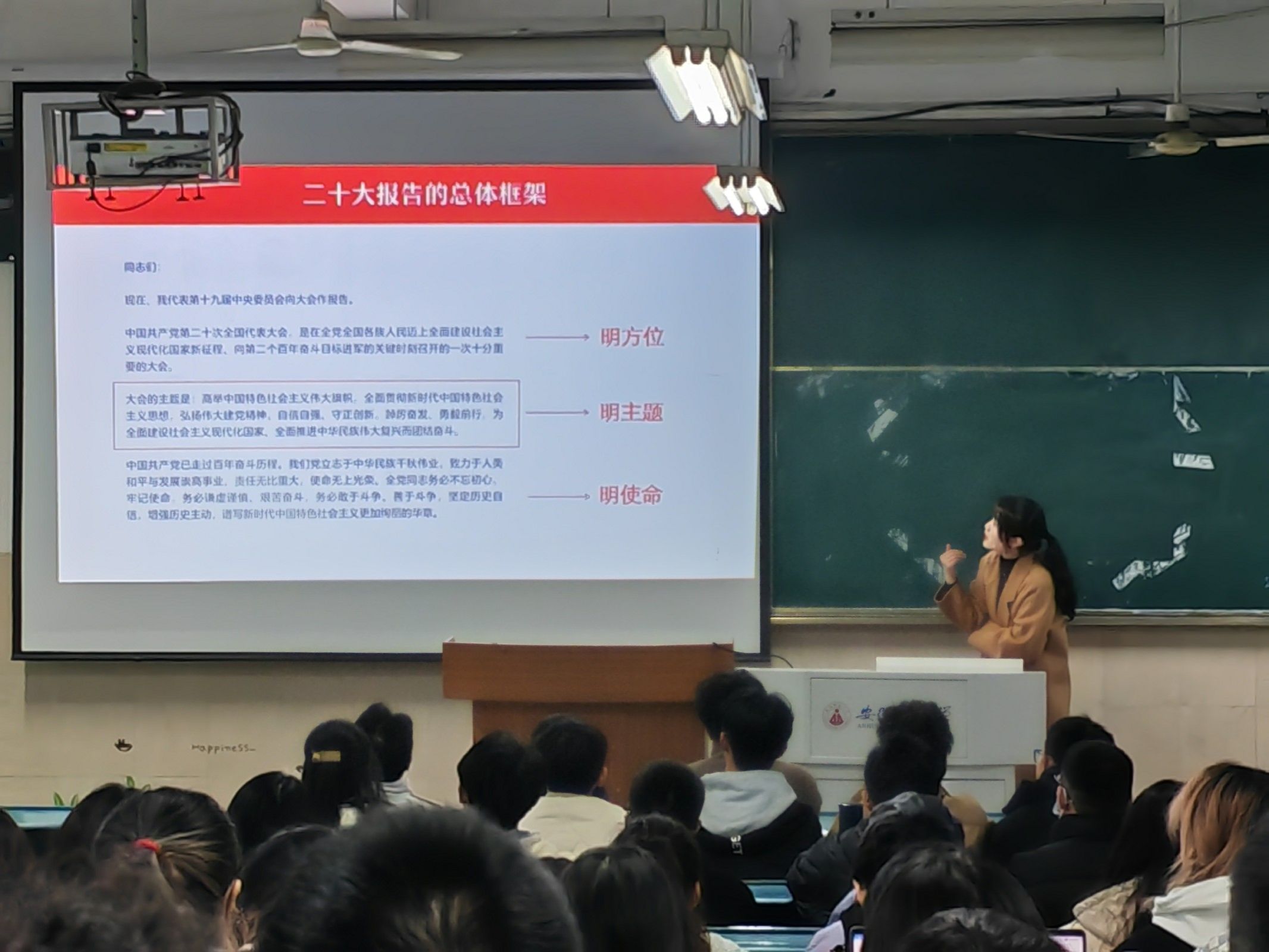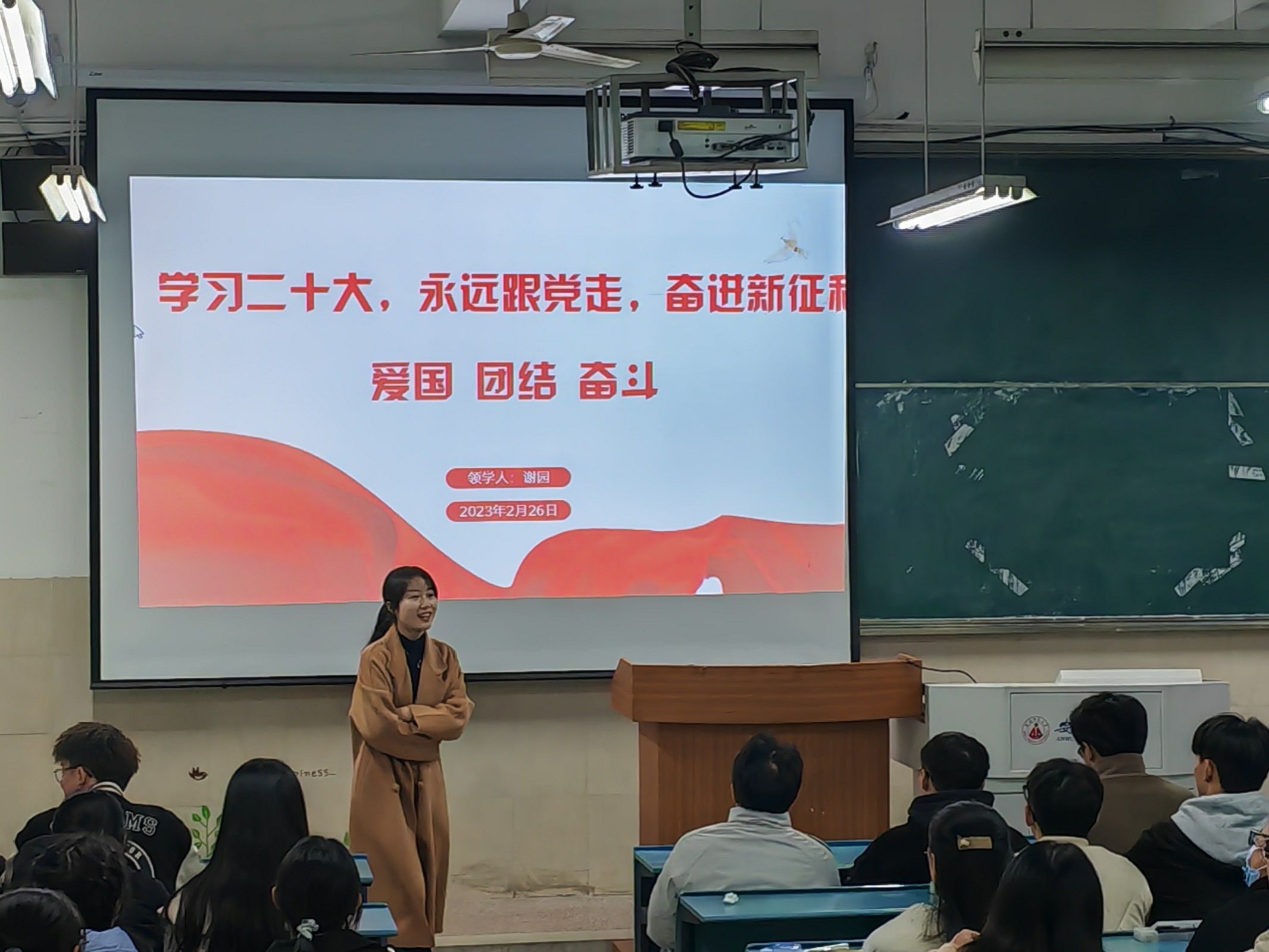 上好“思想引领”第一课。2月26日晚上7:00,2022级旅游管理班级召开“爱国 团结 奋斗”主题班会。辅导员谢园带领大家学习了党的二十大精神。谢园从“伟大变革,取得举世瞩目的伟大成就”“伟大旗帜,取得重大的理论创新成果”“伟大梦想,必将取得举世无双的成功”三个方面向同学们讲述了党的二十大报告。谢园勉励同学们要认真学习党的二十大精神,坚持学思用贯通、知信行统一,切实把党的二十大精神学习成果转化成为“高质量师大人”的思路举措,把个人理想融入到“两大振兴行动计划”的师大梦中。