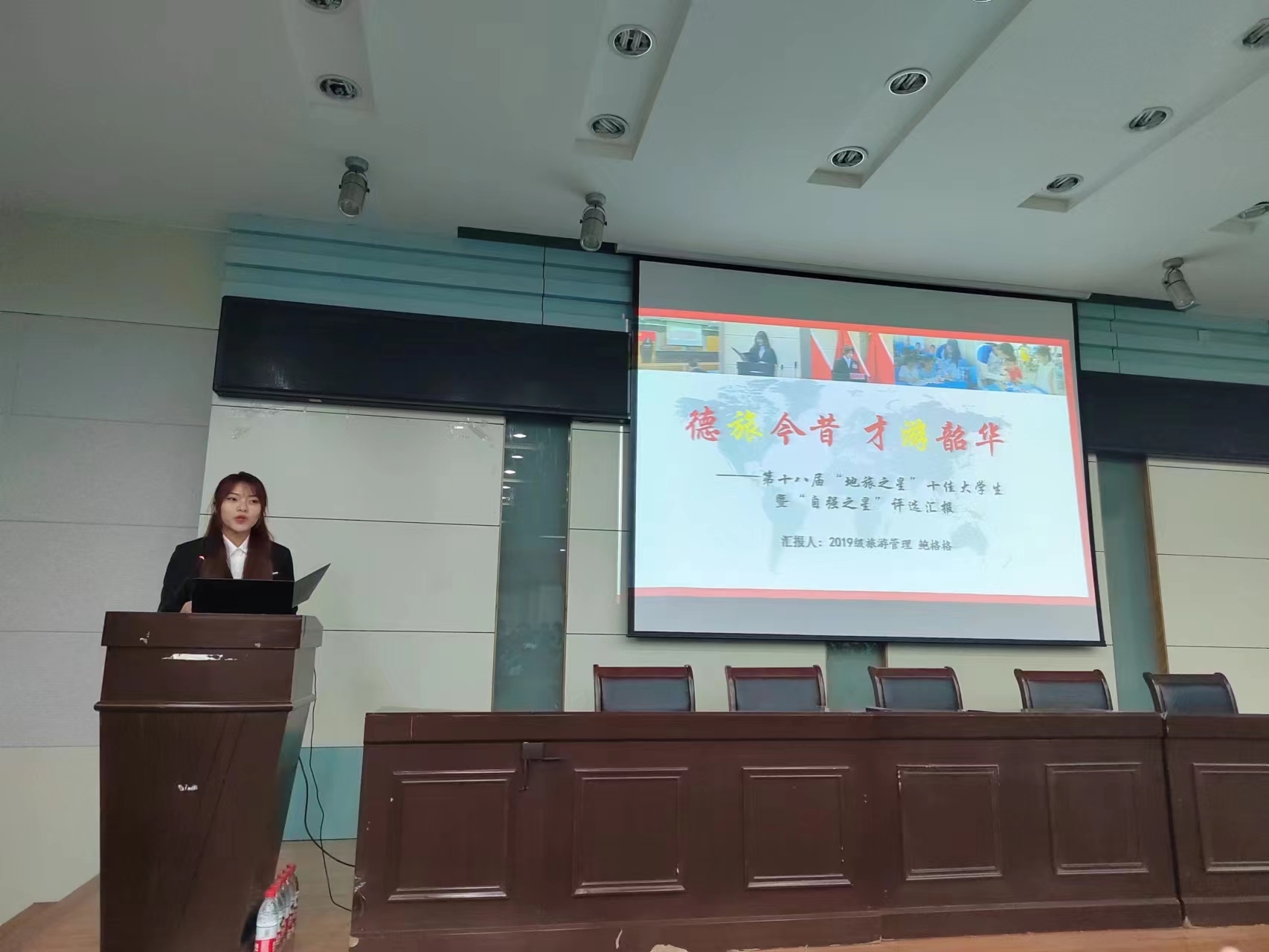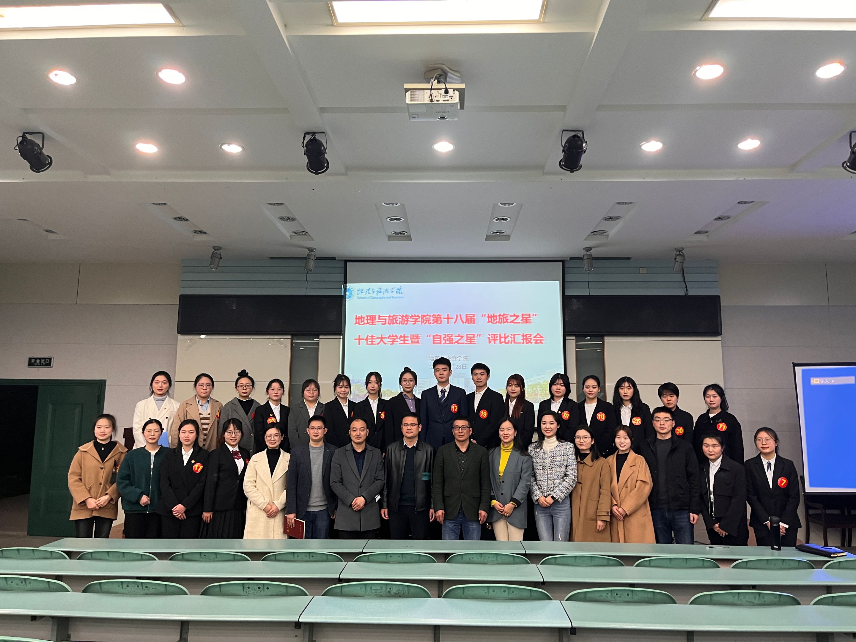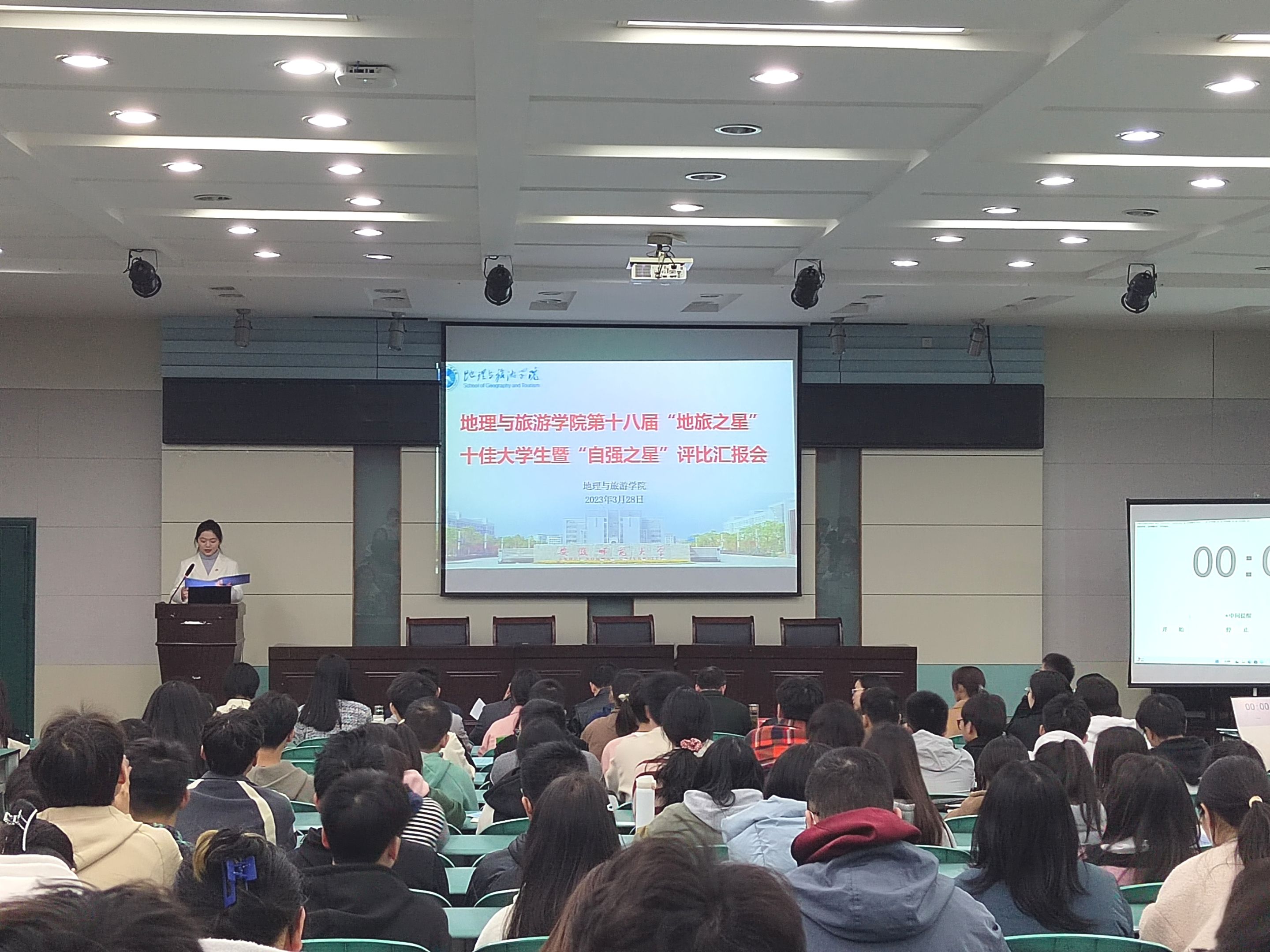为深入学习宣传贯彻习近平新时代中国特色社会主义思想,全面贯彻落实党的二十大精神,进一步弘扬社会主义核心价值观,充分发挥青年典型模范带头作用, 3月28日晚,地理与旅游学院在实验楼101报告厅举行第十八届“地旅之星”十佳大学生暨“自强之星”评选活动。学院党委副书记付勇,地理科学专业负责人朱永恒,地理信息科学专业负责人宋立生,土地资源管理专业教师梁栋栋,旅游管理专业教师阮陵,城乡规划专业教师姚景艳,以及各专业辅导员老师代表出席活动并担任评委,各班学生代表现场聆听并参与评审。