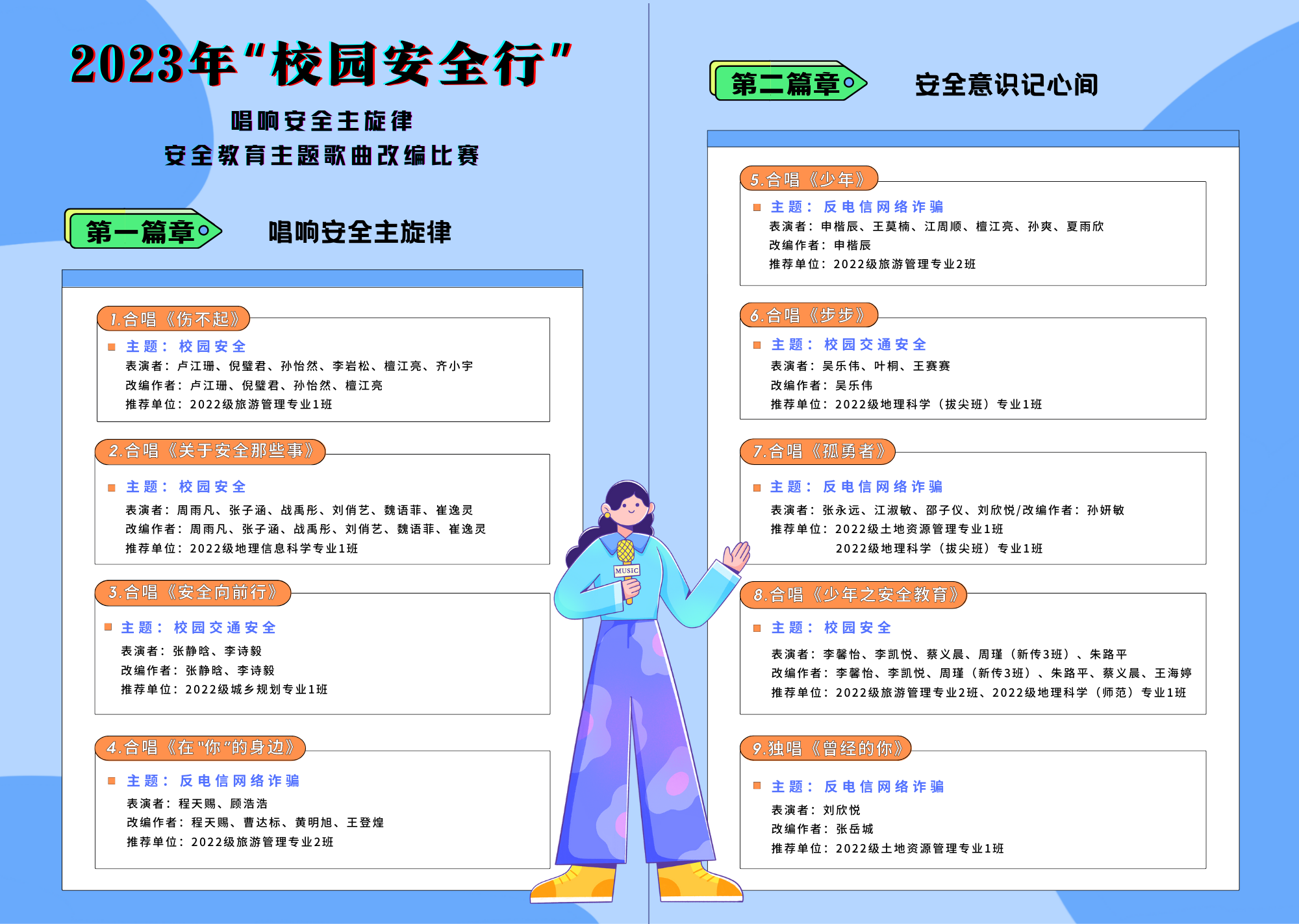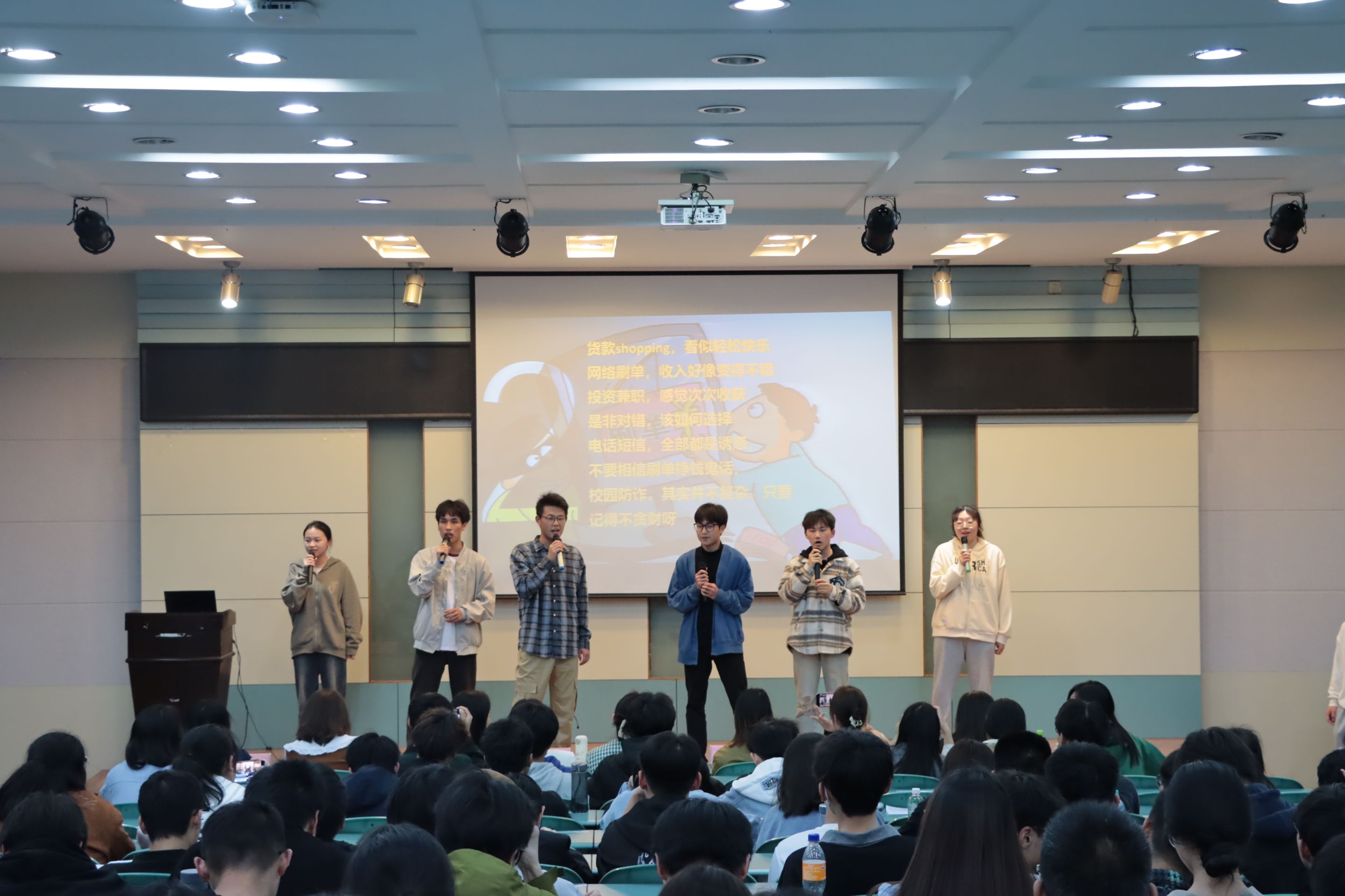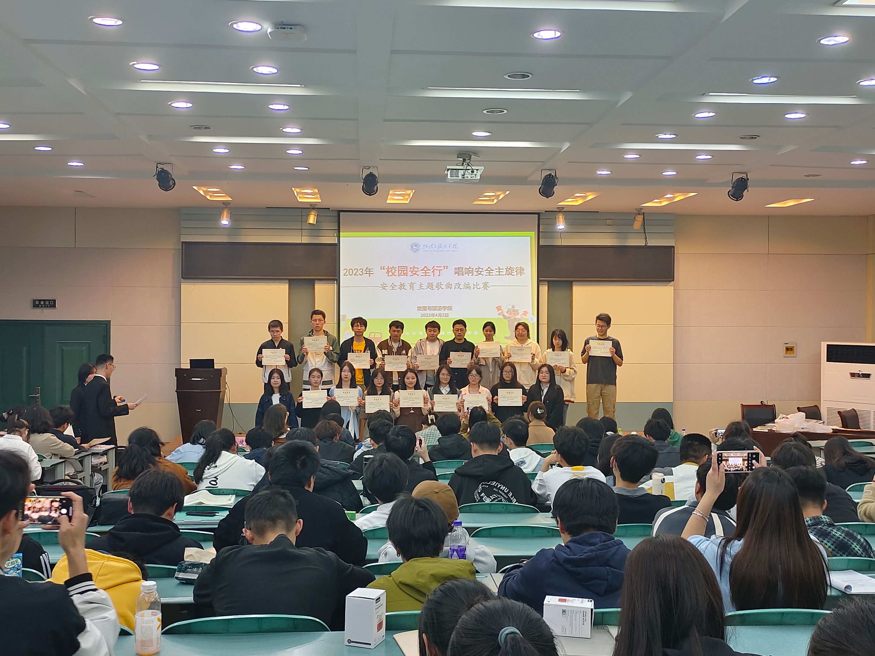 决赛现场共呈现了13个精彩纷呈的歌曲改编作品。2022级地理信息科学专业周雨凡等人在改编歌曲《关于安全那些事》中唱到“就在那熟睡中、外出时,马虎没发现,小火苗,无声地蔓延,要听话,严禁违规电器,不乱接电线”,提醒同学们要谨记宿舍消防安全;2022级城乡规划专业郭宇飞等人带来的一首《霍元甲说交通安全》,告诫同学们“马路上人来人往,行车要礼让,不去争也不抢,多望一望,安全的钟声响”,强调提高校园交通安全意识的重要性;2022级地理信息科学专业袁文静等人带来的《反诈阵线联盟》中唱到“诈骗陷阱须提防,骗子手段变花样,为防止不小心又遇见他,国家反诈中心快下载吧”,提醒同学们防范电信网络诈骗……比赛期间还穿插了三场关于校园安全知识的有奖竞答小游戏,不仅活跃了现场气氛,更是强调了此次活动主题,强化同学们重视校规校纪、遵守校园安全的意识。