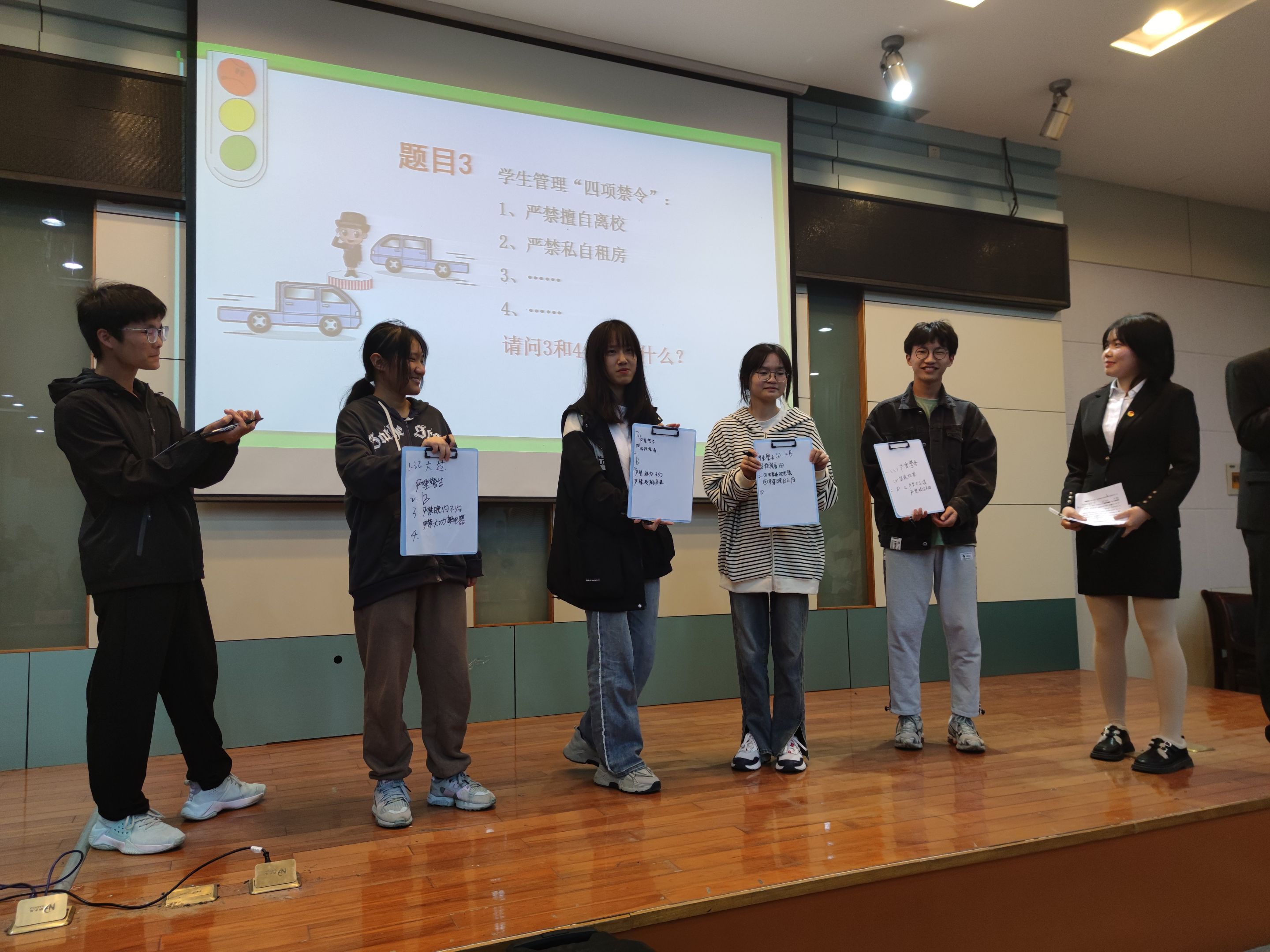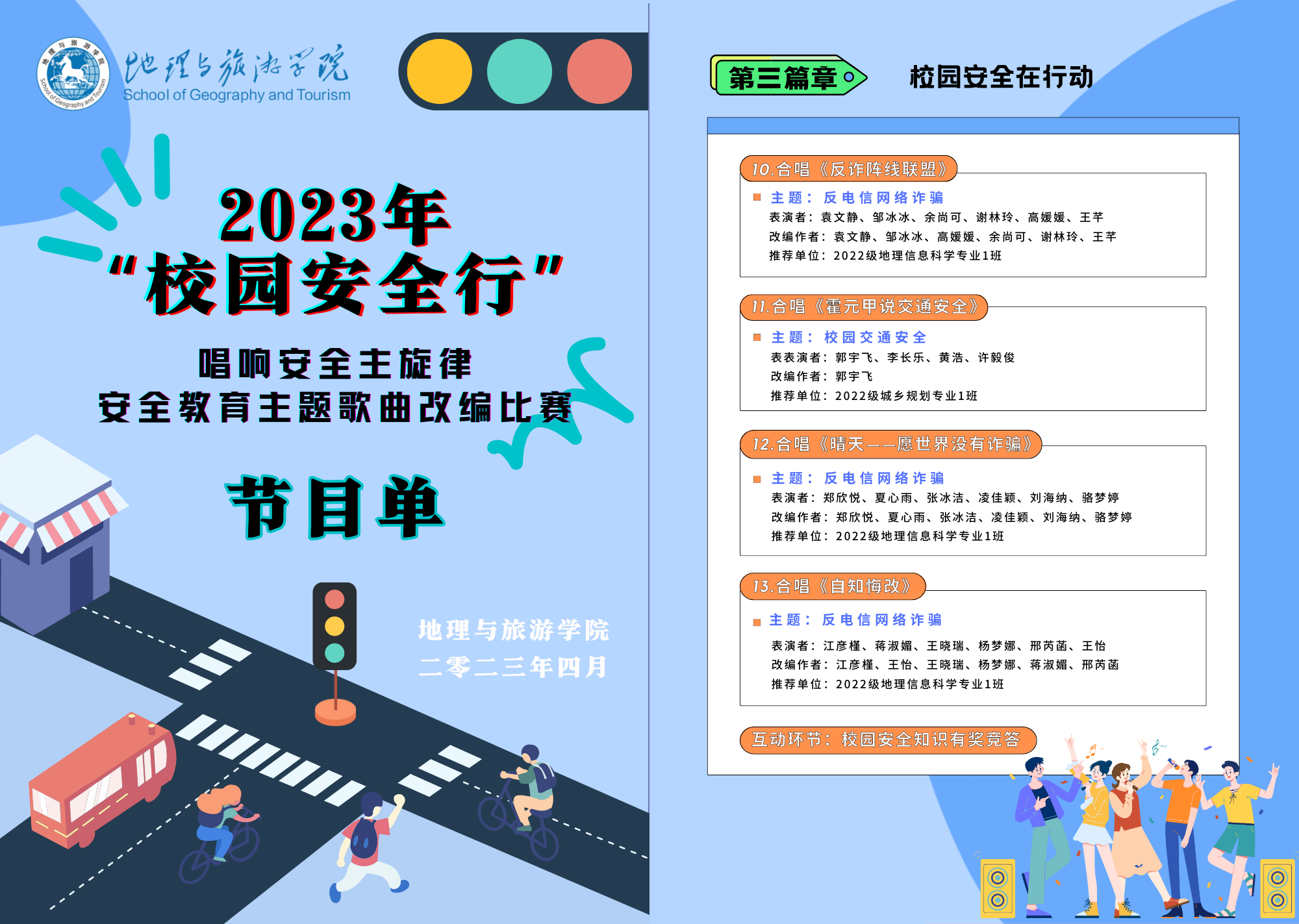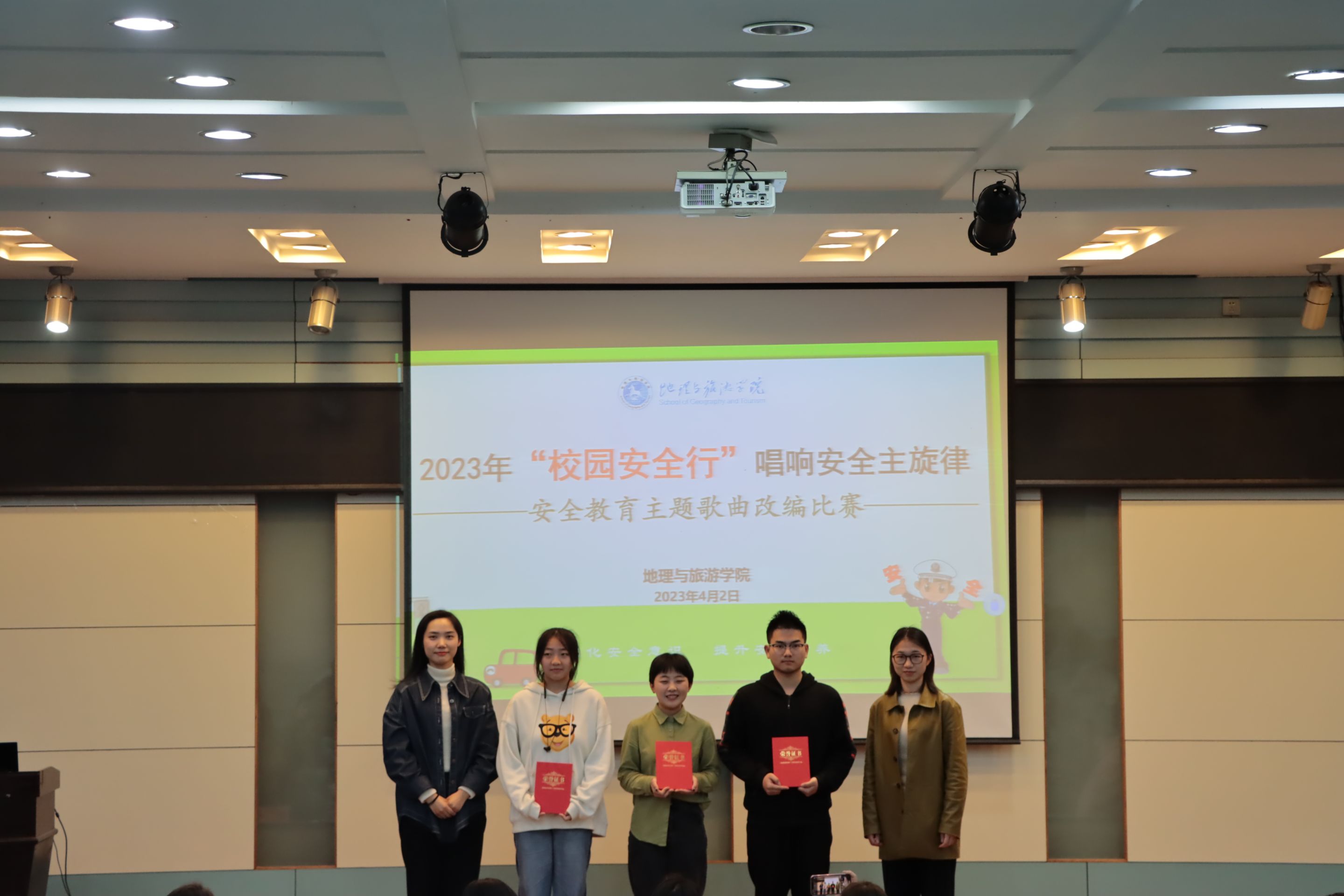 决赛现场共呈现了13个精彩纷呈的歌曲改编作品。2022级地理信息科学专业周雨凡等人在改编歌曲《关于安全那些事》中唱到“就在那熟睡中、外出时,马虎没发现,小火苗,无声地蔓延,要听话,严禁违规电器,不乱接电线”,提醒同学们要谨记宿舍消防安全;2022级城乡规划专业郭宇飞等人带来的一首《霍元甲说交通安全》,告诫同学们“马路上人来人往,行车要礼让,不去争也不抢,多望一望,安全的钟声响”,强调提高校园交通安全意识的重要性;2022级地理信息科学专业袁文静等人带来的《反诈阵线联盟》中唱到“诈骗陷阱须提防,骗子手段变花样,为防止不小心又遇见他,国家反诈中心快下载吧”,提醒同学们防范电信网络诈骗……比赛期间还穿插了三场关于校园安全知识的有奖竞答小游戏,不仅活跃了现场气氛,更是强调了此次活动主题,强化同学们重视校规校纪、遵守校园安全的意识。