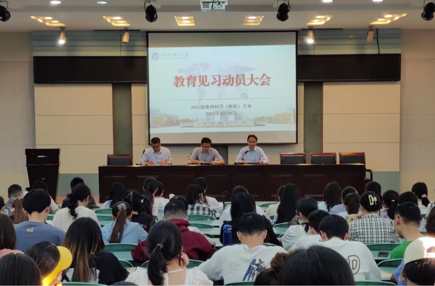 本网讯(何铵楠 周润)4月20日下午,2021级地理科学(师范)专业于实验楼101报告厅召开教育见习动员大会,学院党委副书记付勇、副院长杨兴柱、专业负责人朱永恒及见习指导老师徐光来、周迎秋、汪勇等出席会议,2021级地理科学(师范)全体学生参加。