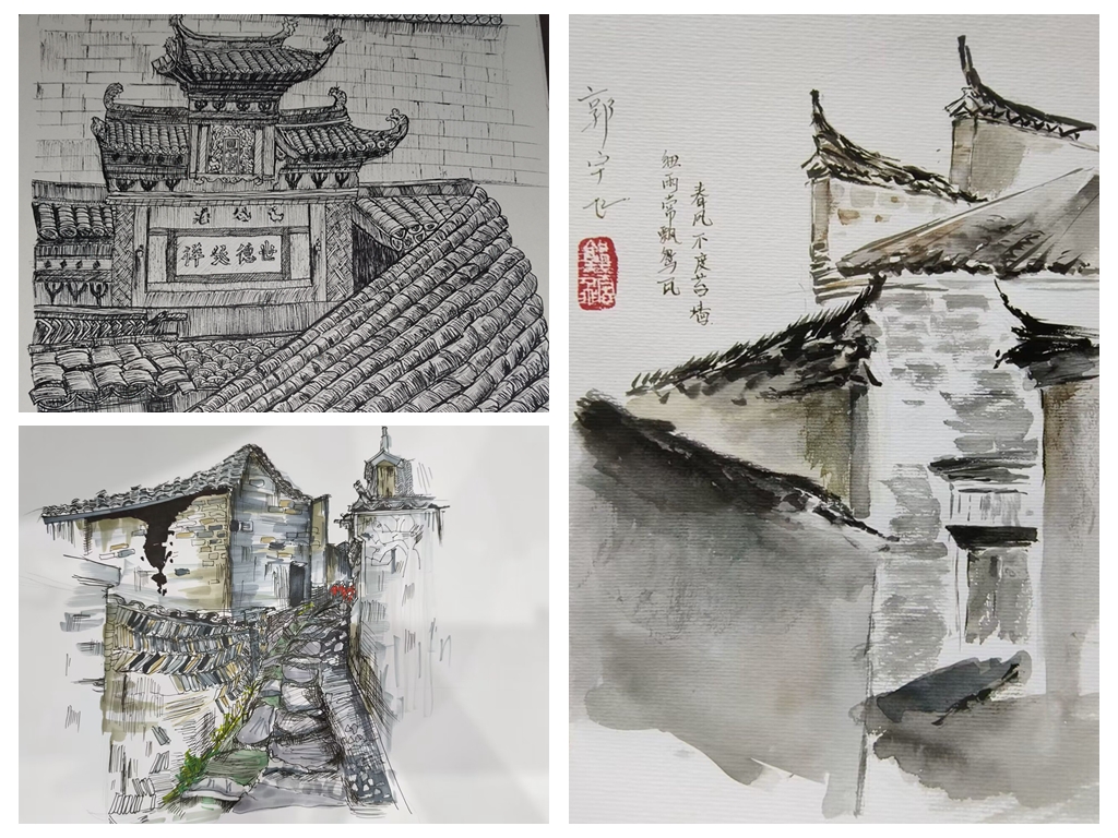 青山绿水引诗赋,墨瓦白墙牵画魂。在为期10天的实习过程中,老师还带领同学们去到了西递、屯溪老街、秀里风景区进行实地考察与写生。通过不同村落形态及布局的对比,深入思考徽派建筑的异同,在提高绘画能力的基础上提升专业素养。