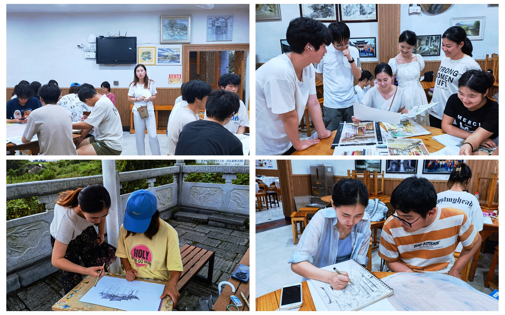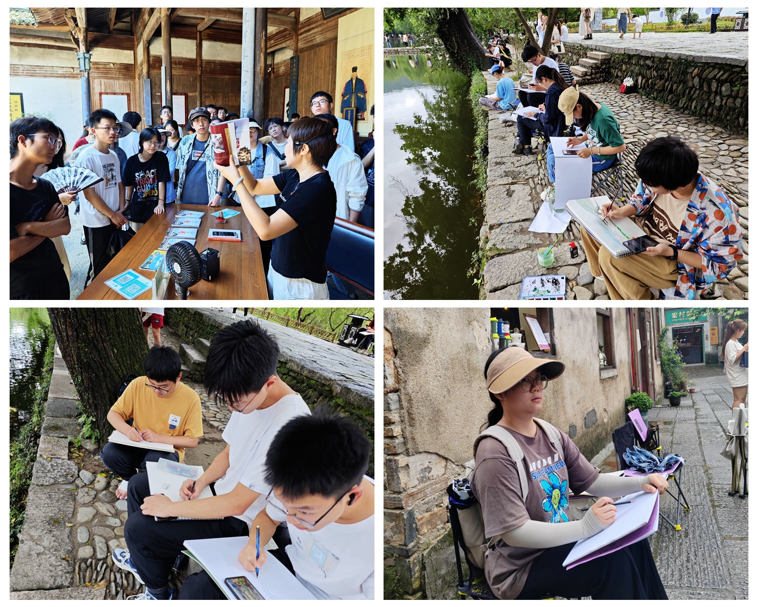 承志树人蕴古镇,卧虎藏龙彰宏村。6月24日初抵宏村,同学们在老师的带领下,结合导游的讲解从宏观角度整体认识、初步了解宏村,亲身感受宏村的地理形态和独具风格的村落布局形式。在接下来的几天里,结合专业知识和实地景观,从南湖到牛肠小巷、从湖边绿荷到湖上石桥、从月沼到木雕、从水墨江南到粉墙黛瓦,同学们用画笔将眼前景转变成笔下画,深入领悟徽派建筑的风格与特点。指导老师每天对同学们的作品进行点评与指导,让同学们了解自己绘画的优点与不足,不断探索自己的绘画风格,在反复实践、练习中强化、进步。