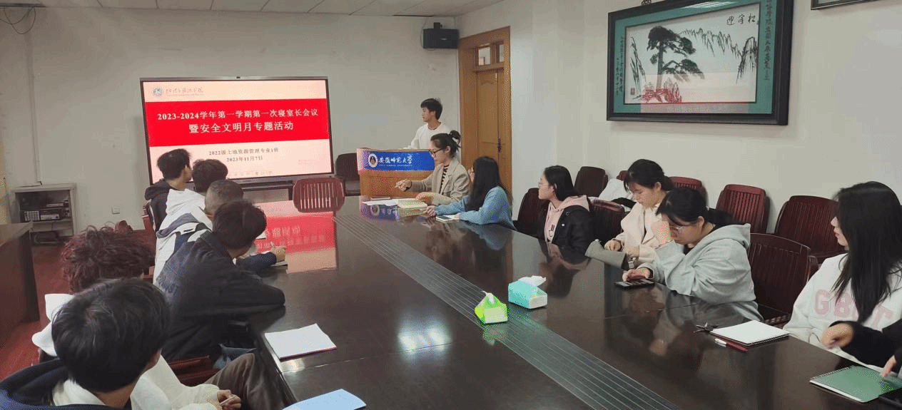 三楼会议室开展安全文明月启动会暨2023-2024学年第一次寝室长会议。会议旨在加强寝室安全管理,提升学生的文明素质,为学生提供一个良好的学习和生活环境。会议由生活委员徐玉峰主持,安全委员李信安担任记录人,辅导员陈祥云及2022级土地资源管理全体寝室长参加了此次会议。