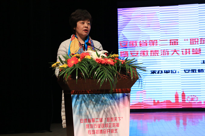 王靖代表安徽省旅游局致辞,她阐述了旅游业在国民经济中的战略性支柱产业地位,并充分肯定了举办该项活动对于我省实施“科教兴旅”、“人才强旅”战略的重要作用。她指出,旅游业作为重要的综合性产业和国民经济战略性支柱产业,其地位作用、辐射带动、发展优势、美好前景愈加凸显,实施“人才强旅”战略对于实现省委省政府提出的“要将旅游业打造成安徽经济社会发展的重要增长极和战略性支柱产业”战略目标显得尤为重要和迫切。王靖表示,“职旅天下”系列活动是联通政府、高校、企业三方的重要平台,为全省旅游就业实践提供了更好、更优、畅通、务实的服务,承载着全省旅游行业对科教兴旅、人才强旅的新期待。她希望与会的专家学者和业界精英能够畅所欲言,共同为安徽旅游人才队伍建设把脉问诊、献计支招;与会的高校充分发挥人才培养、科学研究和社会服务的优势,为“旅游强省”建设贡献人才支撑、智力支撑;参会的企业广纳贤才英才,为旅游发展所用。最后,王靖鼓励广大旅游学子要把握机遇,投身旅游、奋斗旅游、贡献旅游,让旅游为人生添彩!人生因旅游而出彩!