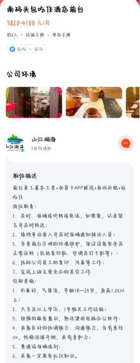 上海山江湖海酒店管理有限公司招聘简章招聘岗位:酒店前台招聘人数:若干人电话:58同城线上申请 -