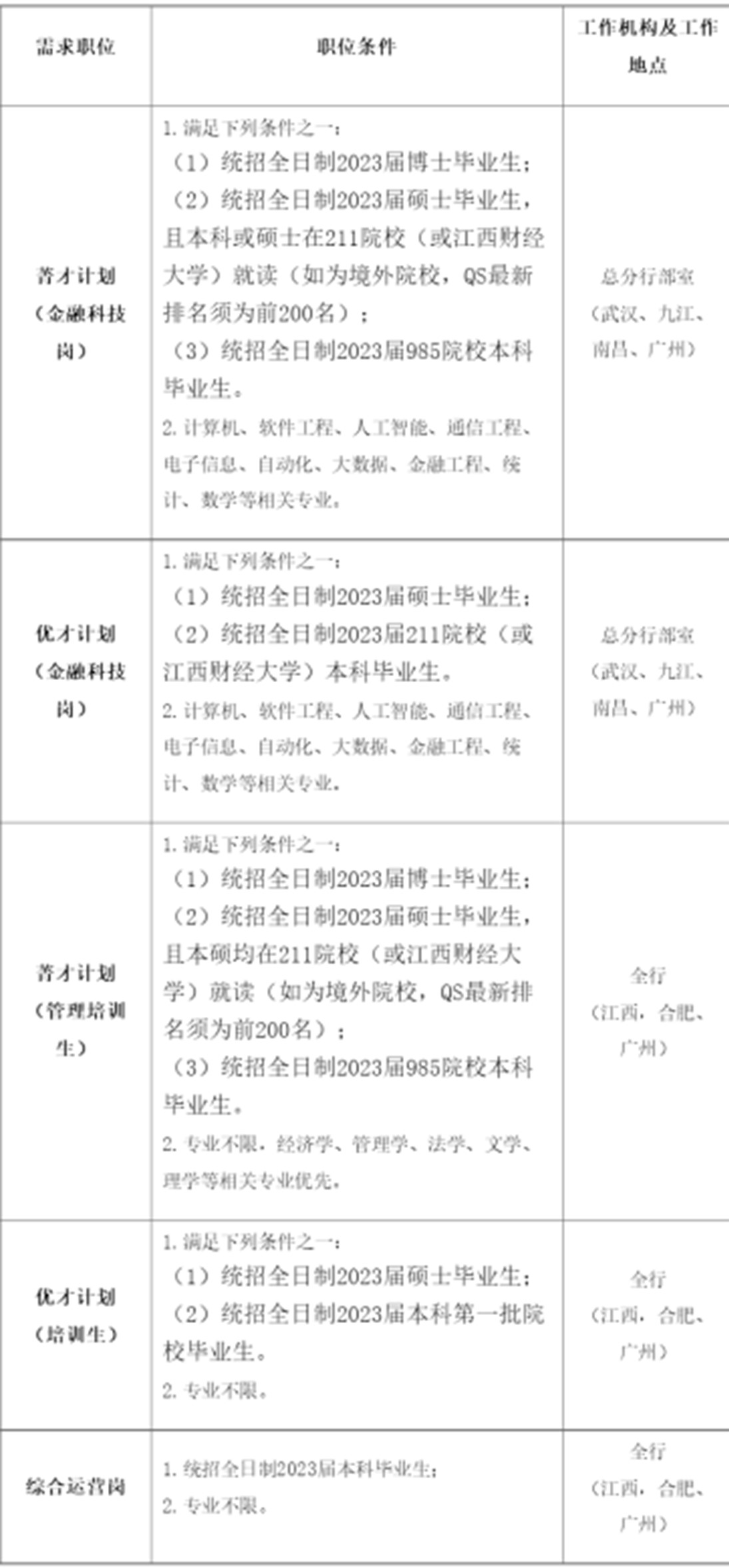 1.2023届校园招聘岗位均为九江银行正式员工。